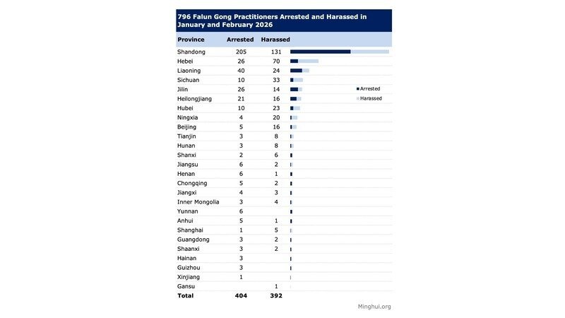 (Minghui.org) Sebanyak 796 praktisi Falun Gong ditangkap atau dilecehkan karena keyakinan mereka pada Januari dan Februari 2026.