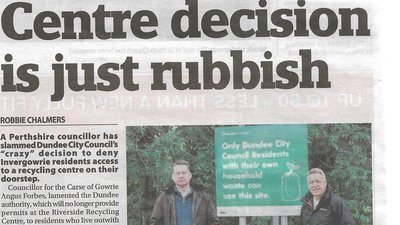 Please use common sense and allow residents of Invergowrie and the Eastern Carse of Gowrie to use the recycling facility at Riverside, Dundee. Don't make us drive 40 miles round trip to recycle