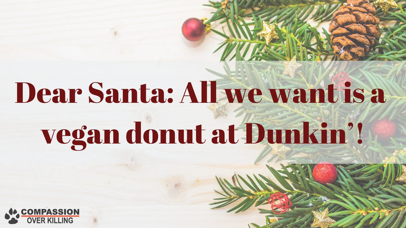 Dunkin’ recently released a limited edition holiday “Dear Santa” donut. But all we have on our list to Santa is a VEGAN donut from Dunkin’! Tweet at Dunkin’ telling the coffee giant that a vegan donut would be the best present this holiday season!