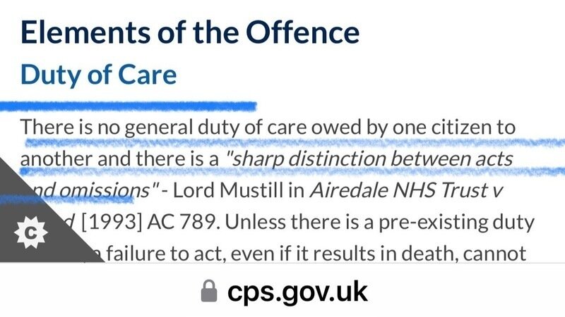 It states in above image there is no duty of care owed by one citizen to another, however also under the same law it states that “members of the public visiting or passing by the workplace when a fatal incident happens” can be prosecuted?!