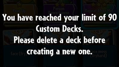 There is a 100 overall deck limit in the game. In other words, you could only have 100 plants+zombies decks in total saved. As a Hard Core player who reached ultimate league since September 2016, I had no motivation playing the game except for trying out new decks as well as decks built by other players. However, the 100 deck limit has been bothering me for months. Although i only keep decks with >70% win rates on ranked, I still have to delete some nice decks in order to try out new decks to keep my decks below 100. By the time now, I have to take a screenshot of every single deck that i have to temporarily delete to spare space in order to try/play new decks. And every time when i want to use my old decks i have to refer to certain screenshots to build them from scratch, swapping out some decks saved in the game. While you (and some low ranked players) don't believe me that it is possible to have more than 100 decks, i am telling you that 100 is super easy to reach for 20 heroes.