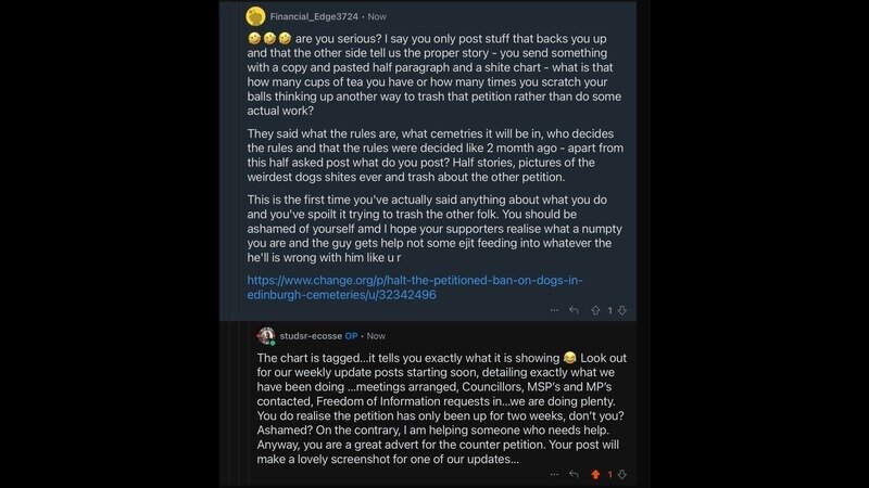 "If I saw someone walking their dog in a cemetery I would ask them what they are doing as it’s not somewhere dogs should be using to urinate and things. What kind of folk walk their dogs in cemetery’s anyway? where’s the petition I’ll sign"