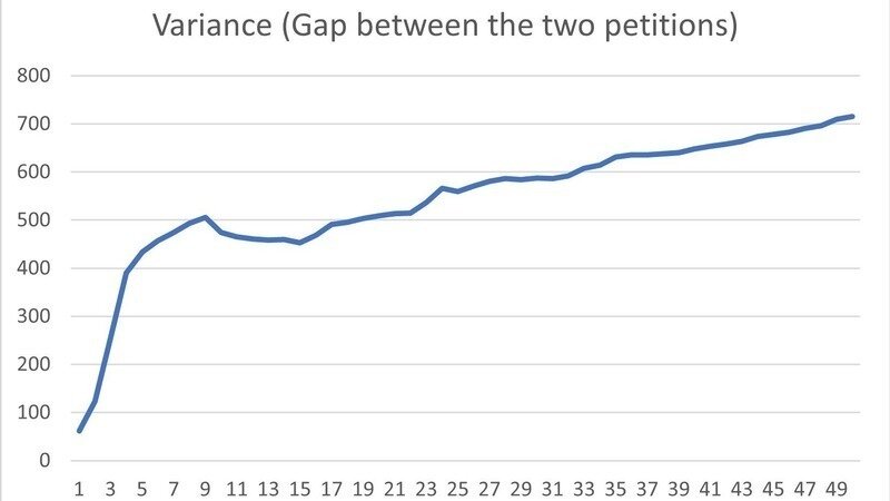 This graph shows the "Variance" between the two petitions, i.e. "the gap" between the total number of signatures on each petition, daily.