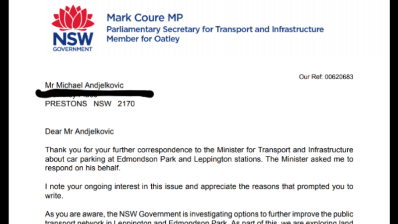 After finding out that NOTHING HAS BEEN DONE REGARDING THE CAR PARKING CRISIS other than the announcement of funding for "Investigations" (read smokescreen to put the issue on the backburner) I ended up sending a 3 Page email the Transport and Infrastructure Minister Andrew Constance, an email to the 6 State MP'S and an email the Mayor’s of Liverpool, Campbelltown and Camden.