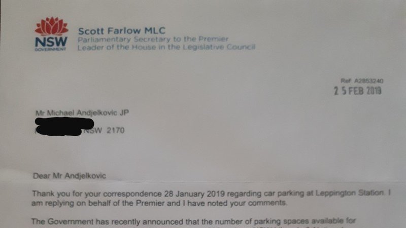 I emailed the Premiers Office late January 2019 regarding the Car Parking at Leppington Station and this is the written reply that I received via the post from her Parliamentary Secretary early March 2019.
