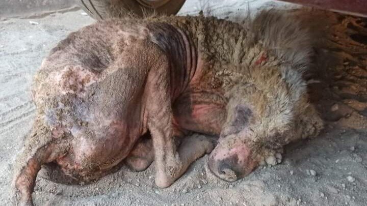 This poor dog has scabies. Dogs like these are ostracized and rejected and often abused and poisoned or shot to death by Egyptian government. They don't care if it's a mother with puppies they will kill the mother dog and leave the puppies.