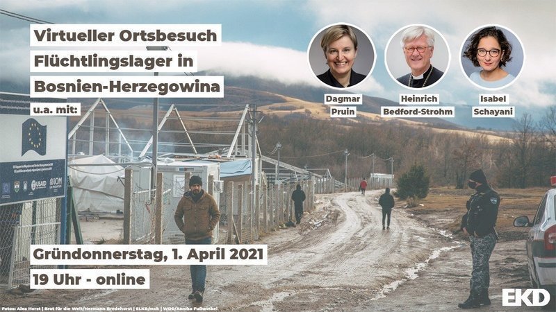 Außerdem möchten wir euch auf diese Gelegenheit zu einer virtuellen Reise nach Bosnien aufmerksam machen: Tausende Schutzsuchende sind aktuell an der bosnisch-kroatischen Grenze in bitterer Not gestrandet. Sie leben in Flüchtlingslagern, im Wald, unter freiem Himmel. An Gründonnerstag, dem 1. April, werden ab 19:00 Uhr der EKD-Ratsvorsitzende Heinrich-Bedford-Strohm und Dagmar Pruin, die Präsidentin von Brot für die Welt / Diakonie Katastrophenhilfe, sich zur Situation der Geflüchteten informieren. Mit dabei sind u.a. die Journalistin Isabel Schayani und die Ärztin Kristina Hilz.