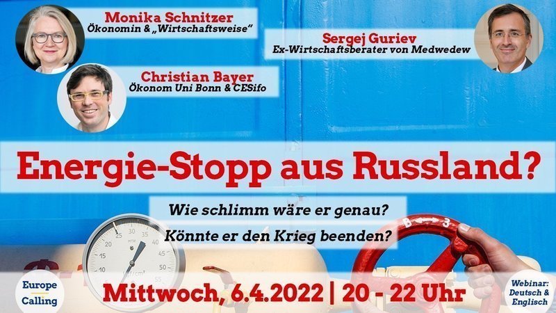 Die fürchterlichen Gräueltaten der russischen Truppen in der Ukraine sind unerträglich. Könnte die EU durch ein Embargo den Krieg beenden helfen? Was wären die Auswirkungen für Deutschland & Europa? Darüber sprechen im Europe Calling Webinar die “Wirtschaftsweise” Schnitzer, Ökonom Bayer & Ex-Medwedew-Wirtschaftsberater Guriev. Gleich anmelden: https://t1p.de/or68w