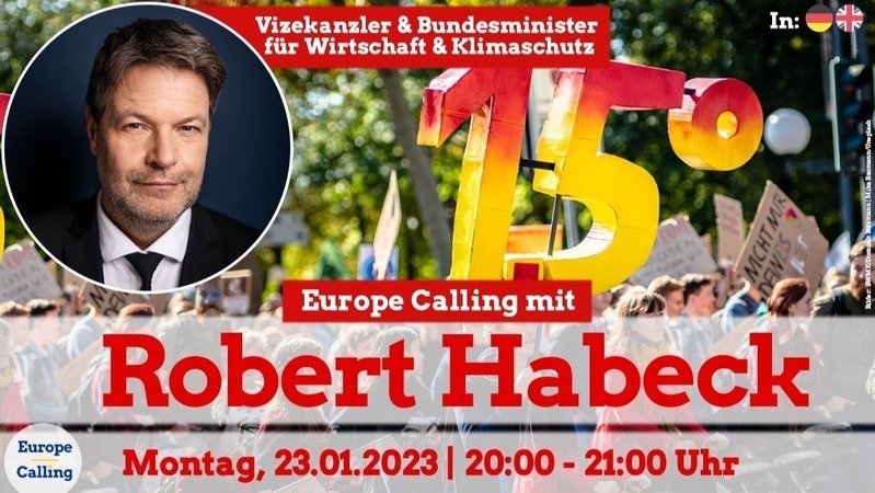 die Zeit nimmt, im nächsten Webinar von Europe Calling sich Euren Fragen zur Klimapolitik zu stellen. Gemeinsam wollen wir mit Robert Habeck diskutieren, warum Deutschland und Europa noch nicht auf dem 1,5°C-Pfad sind und wie er plant, dorthin zu kommen - und was Ihr davon haltet.