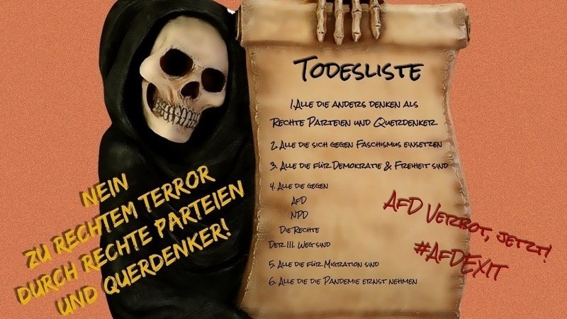 Dadurch dass die AfD bewiesen hat, dass aus ihren Worten Taten folgen, entstehen solche Todeslisten. Selbstverständlich kann man jetzt abwarten bis der nächste Politiker auf seiner Terrasse oder irgendwo anders erschossen wird, oder wir machen etwas gegen diese gezielte Propaganda der AfD.