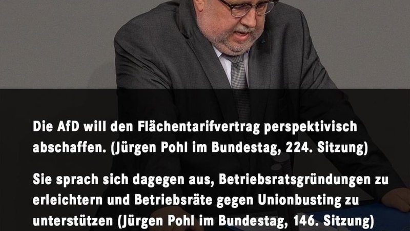 Ja das sagte jener Jürgen Pohl, der sich in der 146. Sitzung des Deutschen Bundestags wie folgt äußerte:“ Als AfD sprechen wir uns dagegen aus, Betriebsratsgründungen zu erleichtern und Betriebsräte gegen Union Busting zu unterstützen“.
