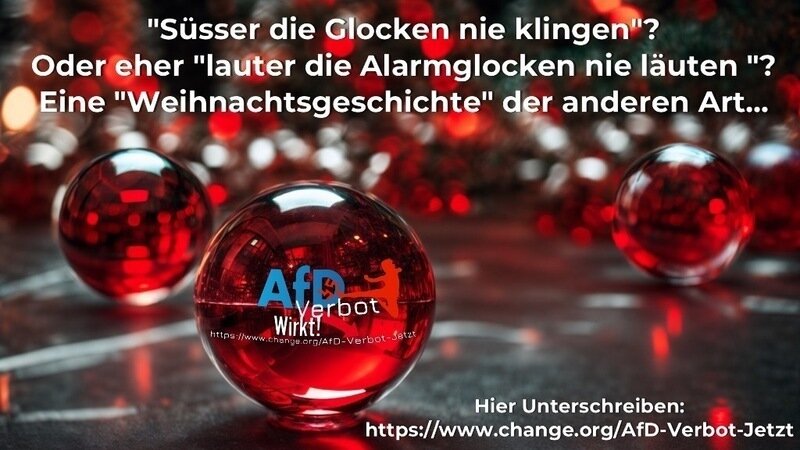 Denn leider steht nicht nur Weihnachten , sondern auch etwas anderes, gefährliches vor der Tür und schon mit einem Fuss drinne.... Die rechtsextreme Partei AfD, die diesem Land etwas anderes bescheren wird als "Frieden und Nächstenliebe" .... Wenn jetzt nichts unternommen wird, wird auch schon sehr bald der zweite Fuss dieser Rechtsextremisten drin sein, und dann gibt es kaum noch ein Zurück.