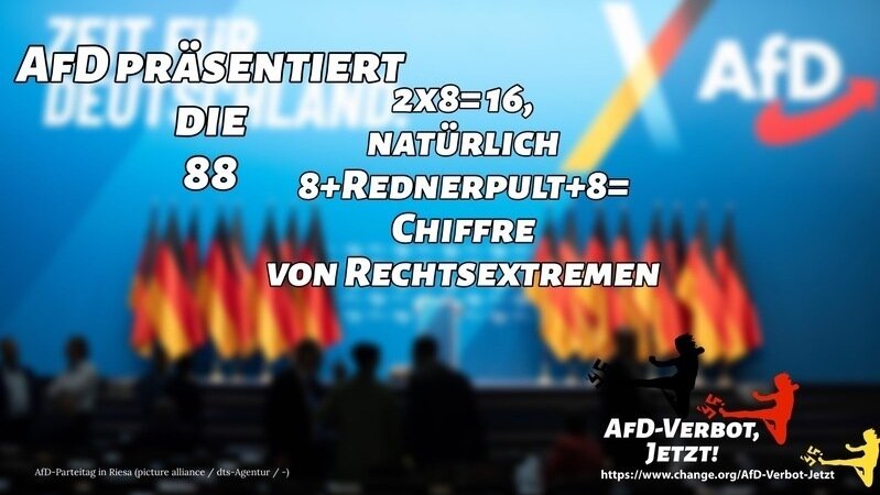 Auf der Bühne standen jeweils acht Deutschlandfahnen rechts und links des Rednerpults – eine symbolische 88, die in rechtsextremen Kreisen als Code für „Heil Hitler“ bekannt ist. Während einige der AfD Gegner dies als Hinweis auf die 16 Bundesländer deuten, ist angesichts der Gesinnung der AfD Vorsicht geboten.