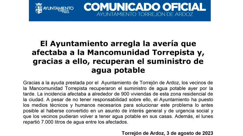 "Los españoles son iguales ante la ley, sin que pueda prevalecer discriminación alguna por razón de nacimiento, raza, sexo, religión, opinión o cualquier otra condición o circunstancia personal o social". Sin embargo, el Ayuntamiento de Torrejón de Ardoz discrimina a sus vecin@s según la zona del municipio en la que vivan y resulta curioso que no asuman la responsabilidad de solucionar los problemas planteados en esta petición a pesar de estar en terreno público siendo competencia municipal, pero sin embargo decidan solucionar un problema en la "Mancomunidad privada Torrepista" con dinero público de tod@s los vecin@s como se indica en el comunicado adjunto emitido por el propio consistorio con fecha 03/08/2023. La presión mediática provocada por los medios de comunicación a los que acudieron los vecinos afectados, hizo que finalmente solucionasen su problema.