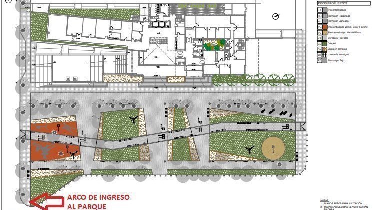 La intervención en nuestro Parque contempla avanzar con hormigón hasta prácticamente el arco de ingreso al predio cambiando totalmente la naturaleza del lugar, sólo lo que ves verde en el plano, será pasto.