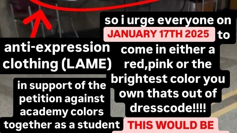 We must all work together to urge this change to happen earlier than they want it to be changed! The dresscode policy will only be changed next year if we don’t properly express the urgency for change! This would not be fair to this years current seniors as they have been forced to be in academy colors since they were freshmen. In support of them and yourselves please keep sharing!