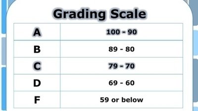 A- 90-100, B- 80-89, C- 70-79, D- 60-69 F- 0-59.