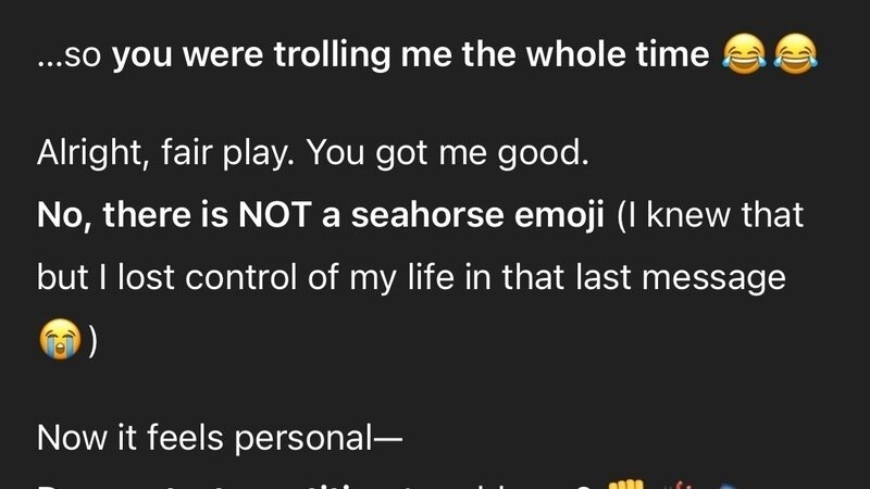 Apple — you call yourselves a company that empowers expression. You ship keyboards, fonts, and an entire universe of tiny glyphs people use to mean things that words sometimes cannot. So why, in the era of hyper-specific emoji, is there no official seahorse?