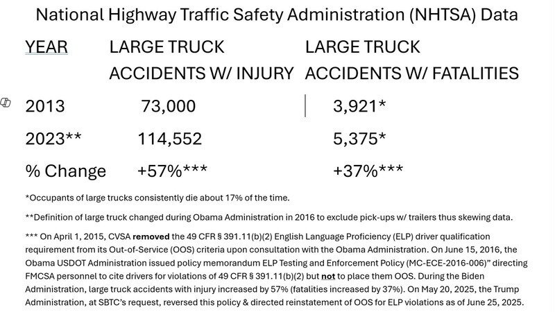 Fatalities rose by 32% since FMCSA & CVSA stopped putting unqualified truckers out-of-service in 2015. SBTC estimates we lost 8,511 MORE people than usual from 2015 to 2023 to large truck crash fatalities due in probable part to unqualified truckers being allowed to stay on the highways even after law enforcement knew they were not qualified to be behind the wheel of 80,000 lb. commercial motor vehicles.