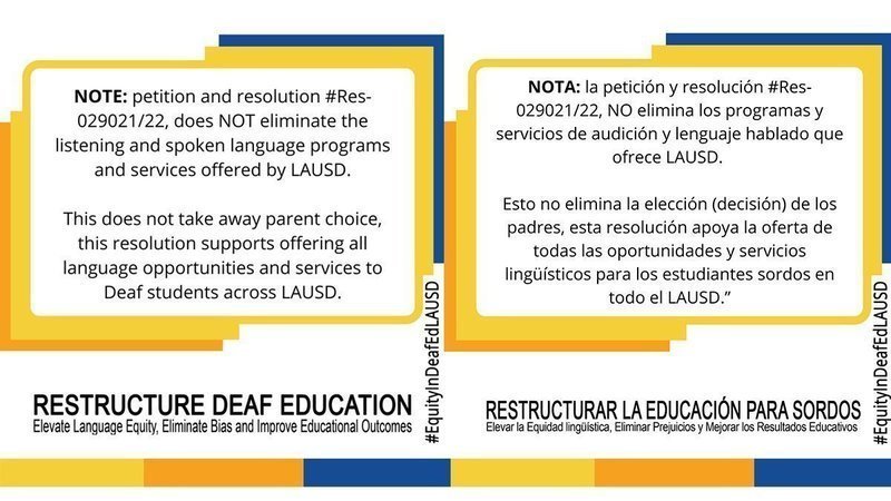 Queremos aprovechar esta oportunidad para aclarar algunos malentendidos con respecto a la resolución Reestructurar la Educación para Sordos, #Res-029021/22. Su objetivo es proporcionar una educación EQUITATIVA para TODOS los niños sordos en todo el LAUSD. NO elimina los programas y servicios de audición y lenguaje hablado que ofrece LAUSD ni elimina la elección de los padres; esta resolución apoya ofrecer TODAS las oportunidades y servicios lingüísticos a los estudiantes sordos en todo el LAUSD.