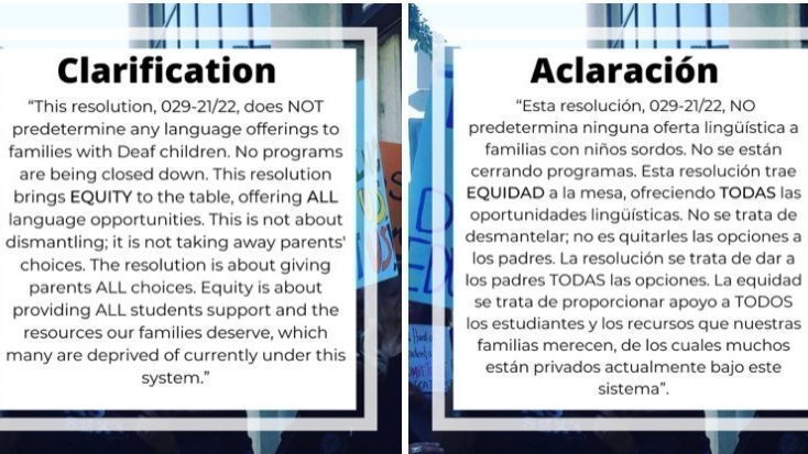ACLARACIÓN: “Esta resolución, 029-21/22, NO predetermina ninguna oferta lingüística a familias con niños sordos. No se están cerrando programas. Esta resolución trae EQUIDAD a la mesa, ofreciendo TODAS las oportunidades lingüísticas. No se trata de desmantelar; no es quitarles las opciones a los padres. La resolución se trata de dar a los padres TODAS las opciones. La equidad se trata de proporcionar apoyo a TODOS los estudiantes y los recursos que nuestras familias merecen, de los cuales muchos están privados actualmente bajo este sistema”.