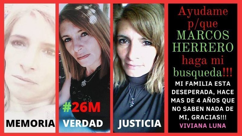 Ante la falta de respuesta por parte de la fiscalía, ya que aun seguimos esperando que nos respondan si traerán a Marcos Herrero en Abril '21 y agostándose el tiempo, nos concentraremos PACIFICAMENTE sin entorpecer el desarrollo cotidiano de los demás. Haciendo acto de presencia en la puerta de la fiscalía exigiendo que la fiscal Ríos nos de una respuesta positiva y afirmativa a nuestro pedido sobre Marcos Herrero y en representación de quien no puede reclamar por si misma porque aun esta DESAPARECIDA; el Viernes 26 de marzo TODOS SOMOS VIVIANA LUNA!!! Apoyanos y ayudala asistiendo con un trozo de tela o nylon negro. Que haya MINIMO 1 persona por cada dia que VIVIANA LUNA lleva desaparecida (1569).