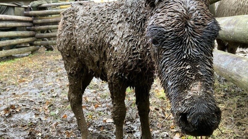 - Mud coated foal shivering with cold trying to find food to keep warm.