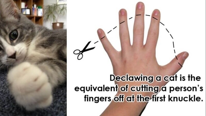 “This typically unnecessary and cruel amputation requires that cats relearn how to walk. Walking on the affected legs remains painful for the rest of their lives and permanently disables them, affecting their balance and climbing abilities. As a result of their chronic pain and weakened defenses, declawed cats suffer from mental anguish and are fearful in situations in which they were once confident,” says PETA. “Thankfully, more and more people understand the grave harm declawing presents to animals, and no veterinarian worth their salt would ever declaw cats”.