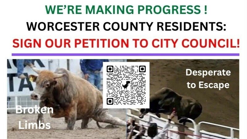 THANK YOU so much for caring about bulls, and helping us root out UNKIND entertainment. Two Worcester City Councilors have agree to start drafting an ordinance on the Tools of Torment, but we need ALL WORCESTER RESIDENTS and as many as possible WORCESTER COUNTY residents to sign out petition. We will help you send a letter to YOUR councilor and the Mayor too!