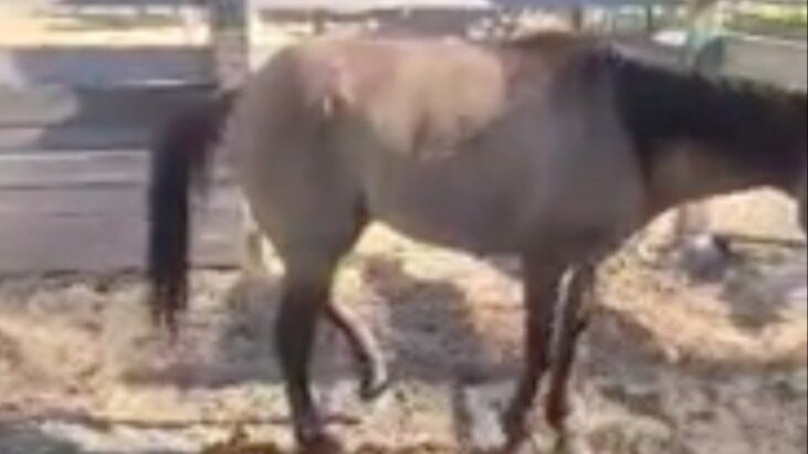 Image is from a video taken by a wrangler showing the horse named Scout, left without care, struggling with a broken leg.