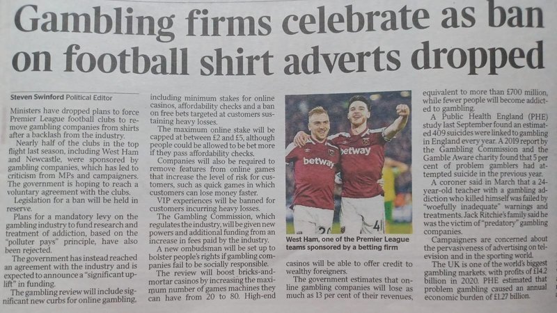 The Times has reported that 'gambling firms celebrate' as the government is preparing to U-turn on its proposals to end gambling sponsorship in football.