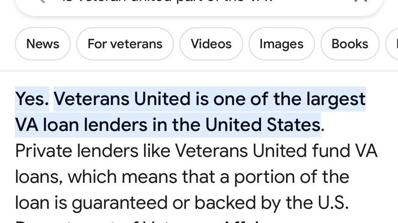 Veterans United Home Loans is not a part of the VA as this statement on Google has shown. It’s misleading, and not factual at all. Veterans United is an “authorized” authority. Meaning even though they are not veteran-owned not affiliated in any way with neither branch of the Armed Forces, the Department of Veteran Affairs grants “special authority” to approved “lenders” to authorize a VA backed loan. Why? I have no idea, considering the VA loan is suppose to protect us against unethical practices. Yet, in my case. Walked me right in the lions mouth.