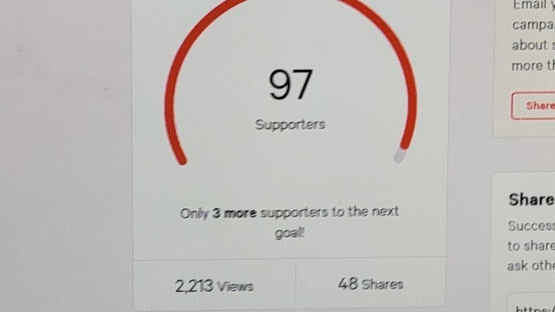 Statistics paint an interesting but often misleading picture. According to Change.org statistics, this petition has been viewed 2213 times. Yet only 97 people have signed it. That's about 4% of those who viewed it. Half that many shared this petition. Actually, probably much fewer than that because I myself have shared it many times.