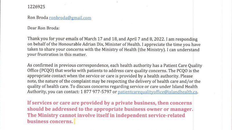 When I originally complained Ministry staff referred me to the Patient Care Quality Office of my regional health authority. That Office told me that it has no jurisdiction over private health care providers and referred me back to the Minister of Health. Today's letter from the Minister of Health staff stated " The Ministry cannot involve itself in independent service-related business concerns."