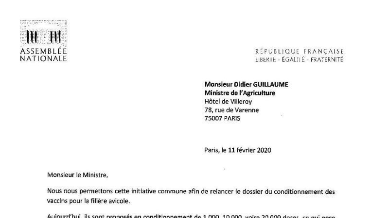 Monsieur Didier GUILLAUME Ministre de l'Agriculture Hôtel de Villeroy 78, rue de Varenne 75007 PARIS Paris le 11 février 2020 Monsieur le Ministre, Nous nous permettons cette initiative commune afin de relancer le dossier du conditionnement des vaccins pour la filière avicole. Aujourd'hui, ils sont proposés en conditionnement de 1 000, 10 000, voire 20 000 doses, ce qui pose problème aux petites structures d'élevage. Nous voulions faire un point d'étape sur l'avancée du cadre réglementaire européen relatif aux médicaments vétérinaires. Dans votre réponse à la question écrite n° 169 du 25 juillet 2019, votre prédécesseur précisait que les pharmaciens et vétérinaires avaient la possibilité de délivrer aux éleveurs un seul flacon sur une boite de 10. Vous comprendrez que ce procédé entraîne une augmentation du prix des vaccins, alors même que les éleveurs sont soumis à une forte pression financière, ce qui est impensable. C'est pourquoi nous vous demandons où en est la problématique des conditionnements de vaccins pour la filière avicole. Restant à votre disposition, nous vous prions de croire, Monsieur le Ministre, en l'expression de nos salutations les plus distinguées. Pascal BRINDEAU Lise MAGNIER Député du Loir-et-Cher Député de la Marne