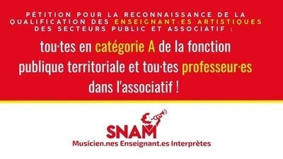 Pétition pour la reconnaissance de la qualification des enseignant·es artistiques des secteurs public et associatif : tou·tes en catégorie A de la fonction publique territoriale et tou·tes professeur·es dans l'associatif !
