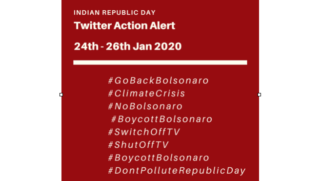 Join Twitter campaigns from 24-26 Jan, follow hashtags: #BoycottBolsonaro #ClimateCrisis #NoBolsonaro #GoBackBolsonaro #BoycottBolsonaro #SwitchOffTV #ShutOffTV #DontPolluteRepublicDay