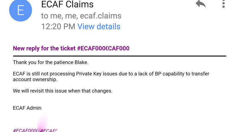 Nearly one month to the day after submitting a "Non-compromised Lost Key" Claim, the ECAF replied with some promising news, "ECAF is still not processing Private Key issues due to a lack of BP capability to transfer account ownership. We will revisit this issue when that changes."