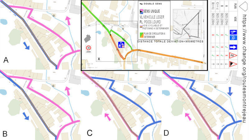 Les différences principales entre les 4 schémas sont pour les plans A et B, depuis les hauteurs de Montréjeau, un sens de circulation en sens unique dans la descente, et une longueur des aménagements piétons- cycliste de la D825 qui portent soit sur la totalité de la route où sont déduits à la partie étroite de 70 mètres en bord de Garonne. Dans ce dernier cas "B", le haut de l'avenue de Luchon est à double sens. Les figures B et C correspondent aux memes schémas inversés avec un plan de circulation dans la montée vers Montréjeau sur la D825.