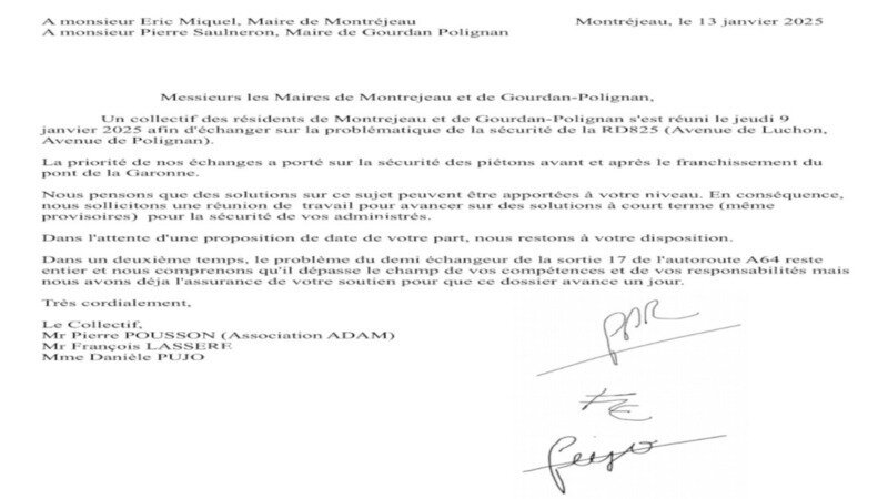 Un collectif des résidents de Montrejeau et de Gourdan-Polignan s'est réuni le jeudi 9 janvier 2025 afin d'échanger sur la problématique de la sécurité de la RD825 (Avenue de Luchon, Avenue de Polignan).