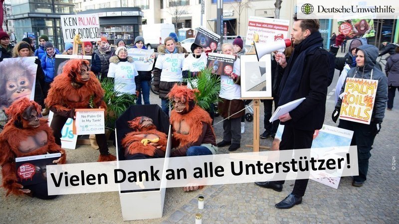 Liebe Unterstützer/innen! Wir waren heute beim European Day of Action vor der EU-Vertretung in Berlin und haben protestiert. Denn schon nächste Woche ist es soweit: Die EU-Kommission soll ihren Beschluss, Palmöl im Tank zu verbieten, endlich rechtskräftig festsetzen. Darum ist es wichtig, dass wir weiter Druck machen. Macht mit und schreibt eure Protestmail: www.duh.de/regenwald/?&wc=CH