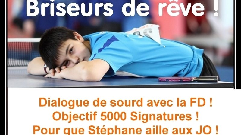 Aussi, nous continuerons notre pétition aussi longtemps que Stéphane ne sera pas sélectionné pour partir à Rio et que vous ne voudrez réviser les modes de séléction...et nous remettrons au Ministère des sports notre pétition avec un certain nombre d'avis de spécialistes du Tennis de table afin d'éclairer nos propos et le bien fondé de notre démarche.