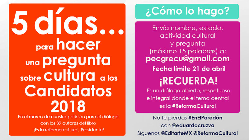 Ahora los invito a iniciar la siguiente etapa, invitándolos a enviar sus preguntas sobre la Reforma Cultural y políticas culturales a los candidatos, ante la posible reunión con los 39 autores del libro.