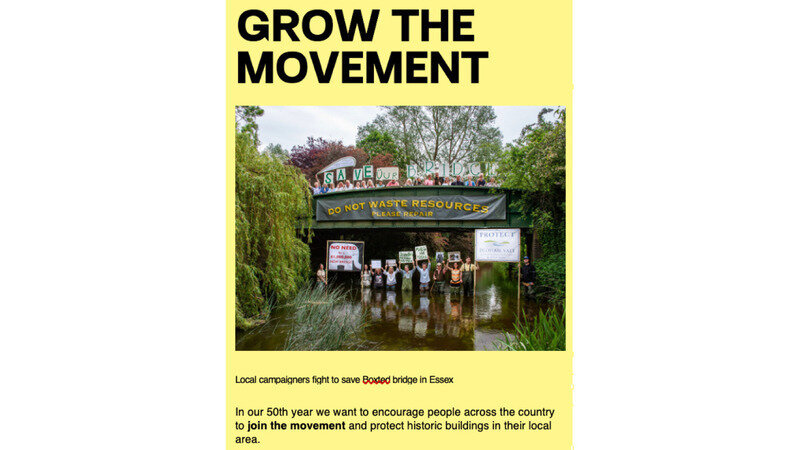 We were honoured to see Save Britain's Heritage 50th anniversary year campaign 'Grow the Movement' used our Save our Bridge demo photo to encourage people to 'join the movement and protect historic buildings in their local area'