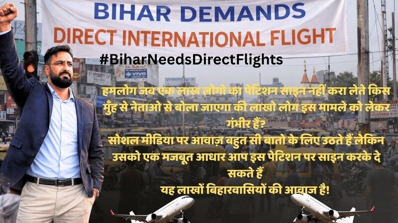 Обновление к петицииEstablish direct flights between Bihar and Gulf countries बिहार- गल्फ डायरेक्ट फ्लाइटहमलोग जब एक लाख लोगो का पेटिशन साइन नहीं करा लेते किस मुँह से नेताओ से बोला जाएगा?