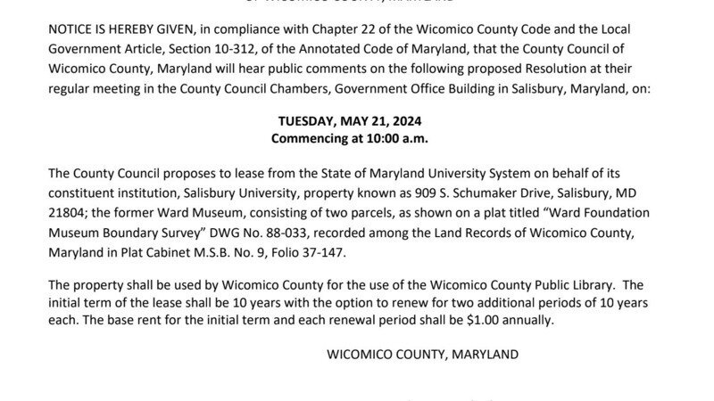 NOTICE IS HEREBY GIVEN, in compliance with Chapter 22 of the Wicomico County Code and the Local Government Article, Section 10-312, of the Annotated Code of Maryland, that the County Council of Wicomico County, Maryland will hear public comments on the following proposed Resolution at their regular meeting in the County Council Chambers, Government Office Building in Salisbury, Maryland, on: