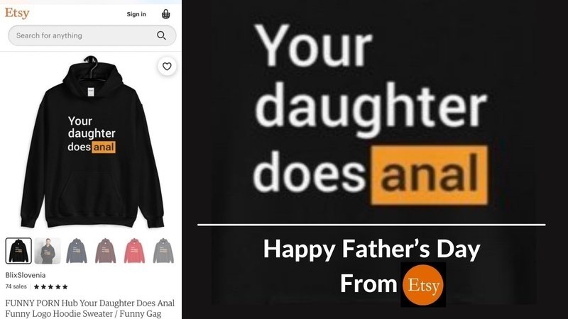 As if you needed more reasons to dump Etsy. I’ve seen more merch with more porn-inspired slogans promoting the degradation of women and girls, flogged as ‘humour’ on the online global marketplace giant’s platform. This time, a range of hoodies and tees wielding the slogan ‘Your daughter does anal’ - styled with Pornhub’s black-and-gold branding.