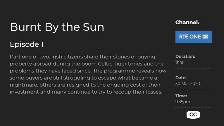 The TV program 'Burnt by the Sun' is due to air RTE 1 at 21:35 on Mon 30th Mar and Mon 6th April. It will cover the experiences of Irish people who purchased foreign property and subsequently experienced problems.