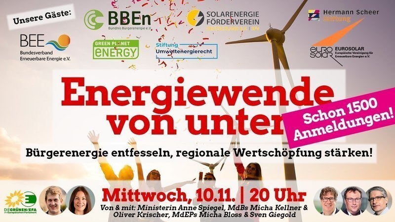 der Ausbau der Erneuerbaren Energie in Deutschland ist mächtig ins Stocken geraten. Um die Klimaziele zu erreichen, müssen wir dringend und unkompliziert grünen Strom ankurbeln. Die Bürgerenergie - also lokale grüne Energie aus dezentralen Wind- und Solaranlagen auf Dächern und Freiflächen - ist ein Schlüssel zur Energiewende. Denn regionale grüne Energie erlaubt es uns allen, an der Energiewende teilzuhaben. Die Kommunen verdienen einen größeren Anteil an der Wertschöpfung. Bürgerinnen und Bürger und Unternehmen aus der Region sollten als Investoren weiterhin zum Zuge kommen, um die Energiewende wieder zu beschleunigen.