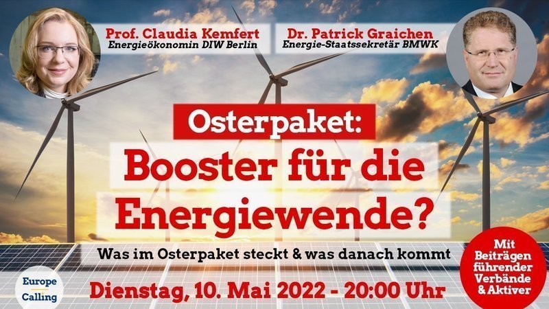 Für eine klimaneutrale Energieversorgung muss Deutschland endlich den Energiewende-Booster zünden. Der erste Schritt: Das 600-Seiten “Osterpaket” der Bundesregierung. Doch was steckt darin? Das diskutiert Europe Calling e.V. mit Staatssekretär Patrick Graichen & Top-Energieökonomin Claudia Kemfert. Mit dabei: Verbände mit ihrer Kritik. Gleich anmelden: https://t1p.de/vc4g